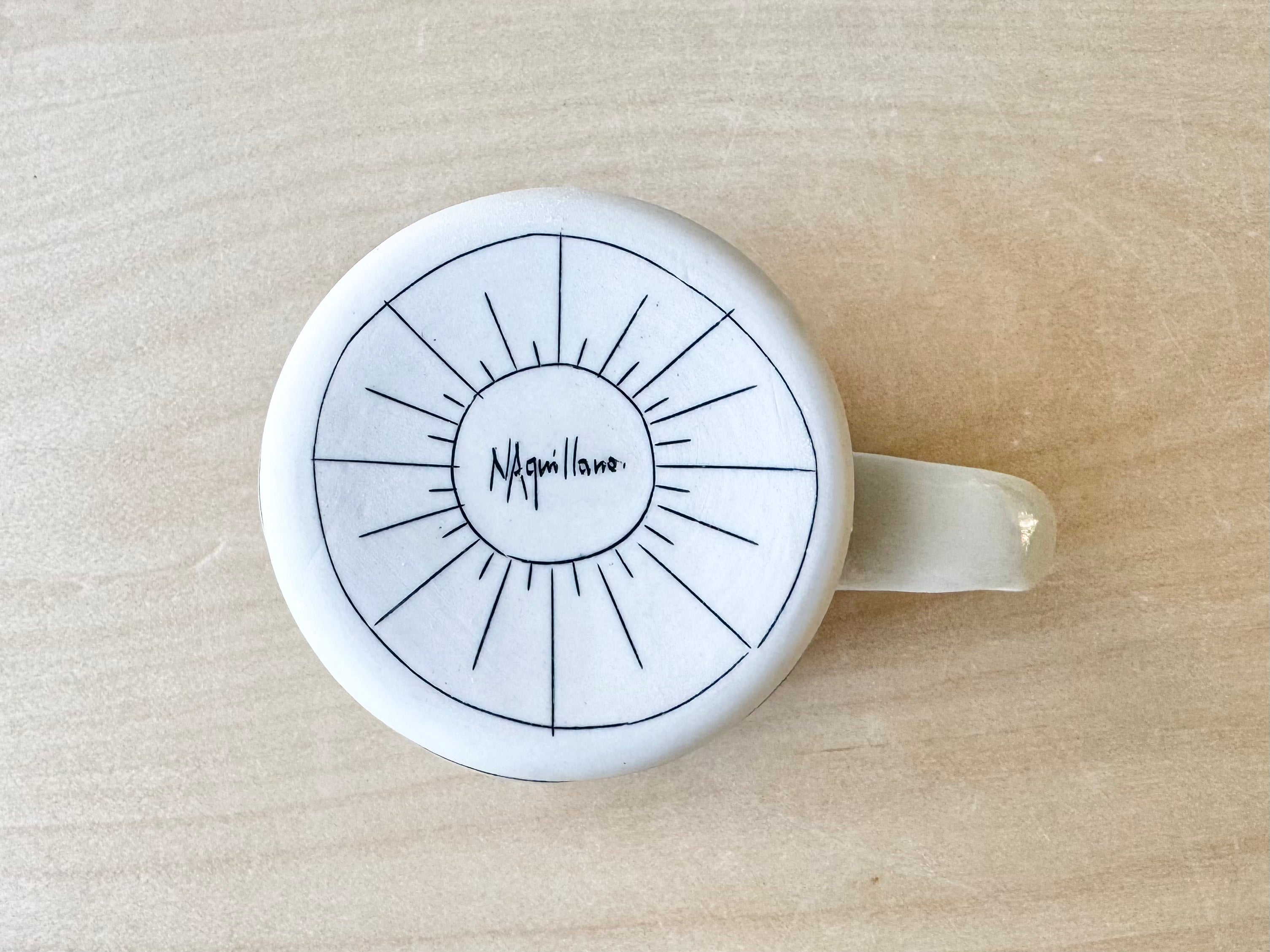 A one-of-a-kind mug inlaid with imagery. Ready-to-ship mug holds approximately 16 ounces and is microwave & dishwasher safe!